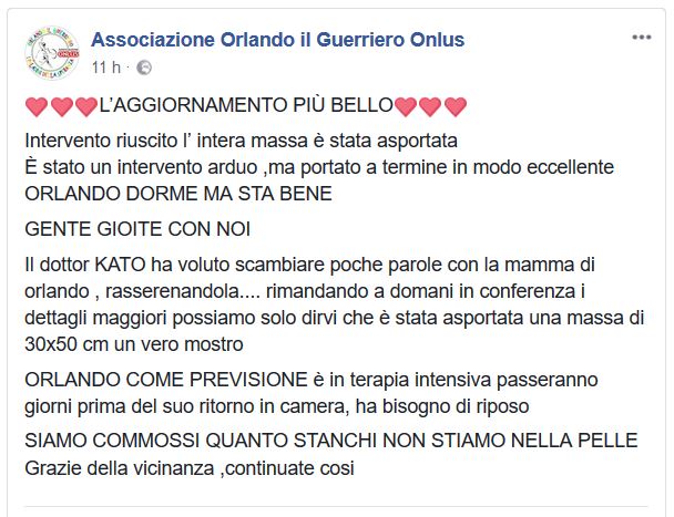 “Sono state ore di lunga attesa per Orlando, la sua famiglia e gli amici. Ma i primi aggiornamenti che giungono dagli Stati Uniti, nello specifico da New York dove il giovane di Soverato affetto da sarcoma è stato sottoposto a delicato intervento chirurgico, sono positivi. L’intera massa tumorale è stata asportata, il ragazzo dorme ma sta bene. Attualmente, secondo le informazioni postate sui social, è in terapia intensiva dove rimarrà alcuni giorni prima di essere trasferito in camera.”