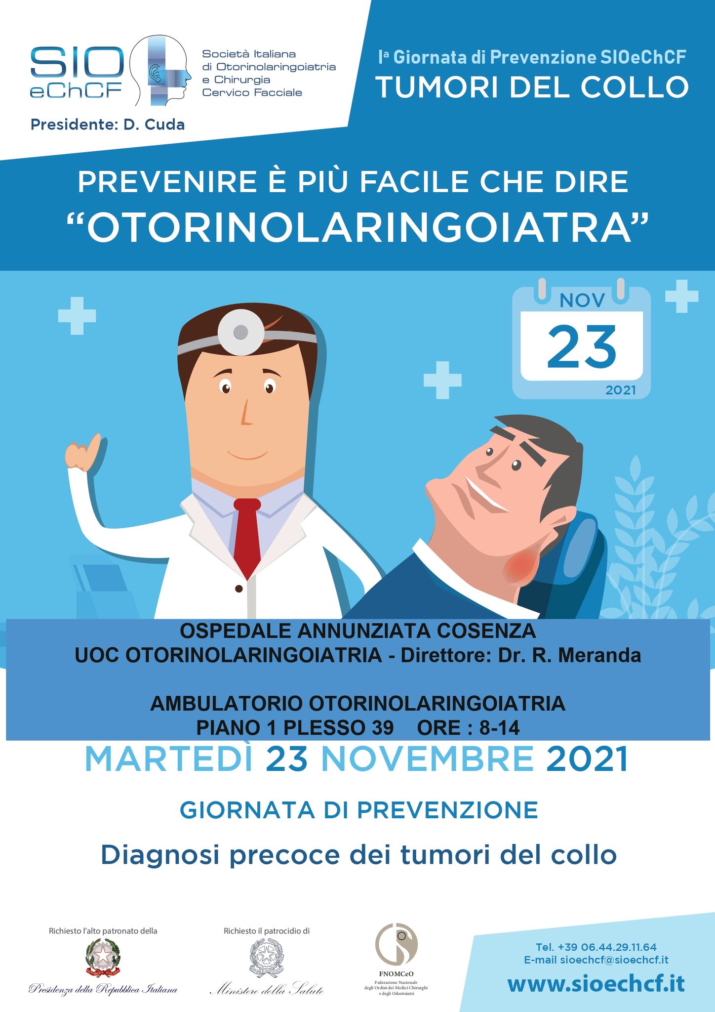 Per la prima volta anche la UOC di ORL dell’ospedale Annunziata di Cosenza si allinea a tale campagna di screening Nazionale garantendo visite gratuite per la giornata di martedì 23 novembre con orario 8-14 presso l’ambulatorio divisionale sito al I piano del plesso 39