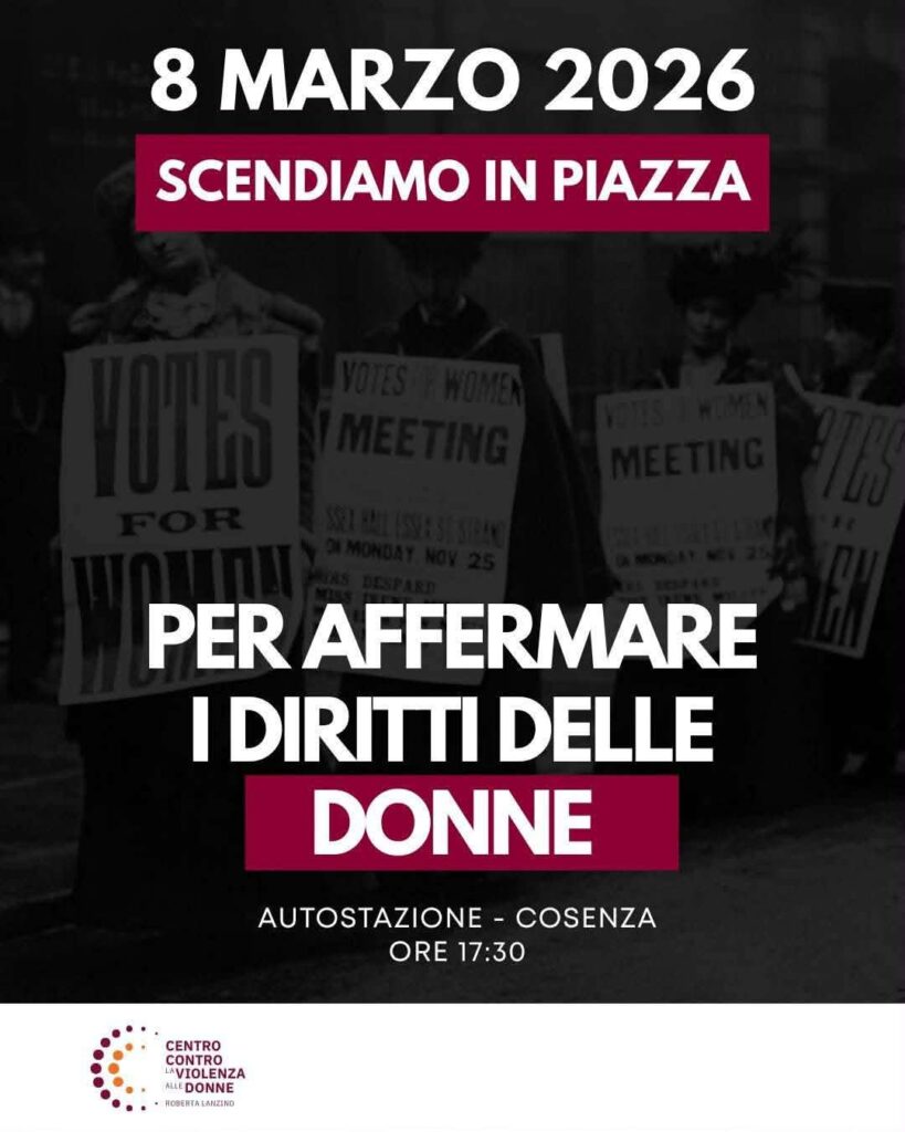 Nel pomeriggio, alle 17,00, ci sarà la manifestazione che partirà dall’autostazione: “manifestare a Cosenza in una piazza pericolosa per tutti, ma soprattutto per le donne, é atto politico che vuole mandare alla città, alle istituzioni e alla comunità un messaggio chiaro di libertà, ribadendo il diritto di muoversi e attraversare spazi in ogni ora del giorno”, afferma il CAV concludendo con un appello: “L’otto marzo manifestiamo e scioperiamo contro la guerra, massima espressione della violenza patriarcale, diciamo NO al DDL Bongiorno!”.