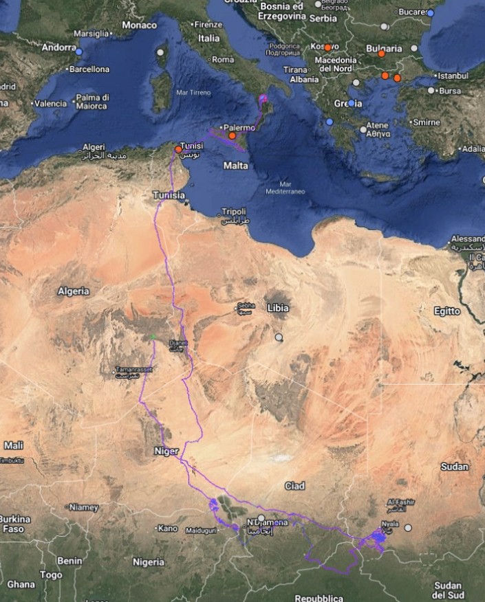 Pochi giorni fa ha iniziato il viaggio di ritorno verso nord che, si spera, la riporterà in Calabria. Attualmente si trova in Algeria, ma la rotta sembra indicare proprio la direzione della sua terra di nascita.