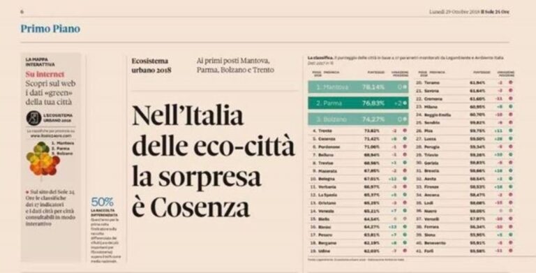 Il Sole 24 Ore: Performance ambientali e vivibilitĆ , “La sorpresa ĆØ Cosenza”