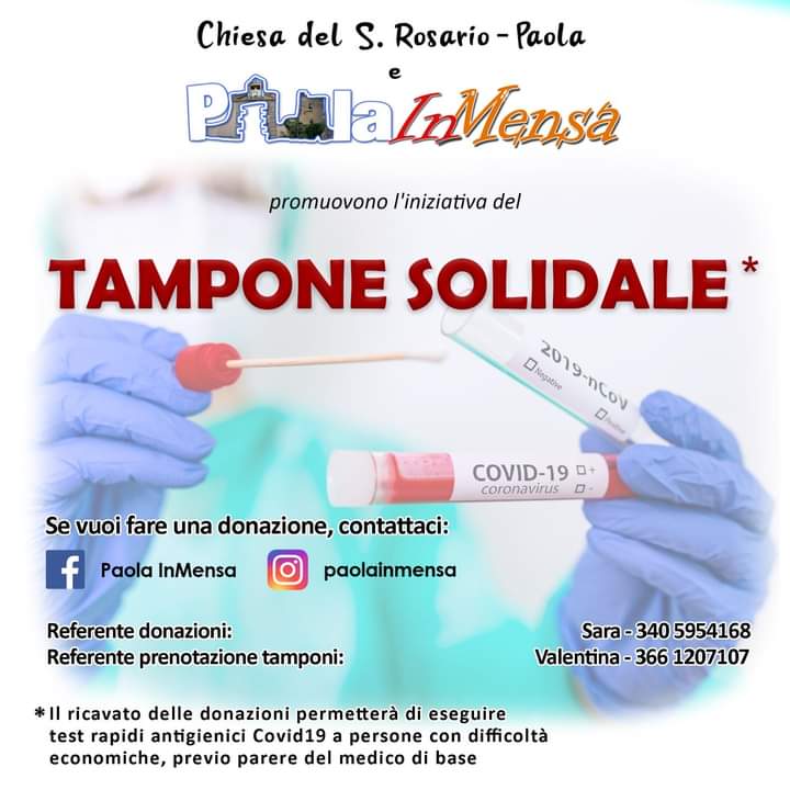 “Dell’altruismo dell’associazione “PaolaInMensa” sempre sensibile in ambito sociale, i Paolani, potranno contare sul Tampone solidale. A partire da oggi, Paola InMensa promuove una raccolta fondi utile per sostenere il costo di test rapidi antigienici COVID19 per persone in difficoltà.”