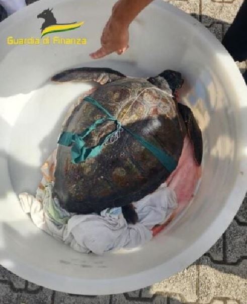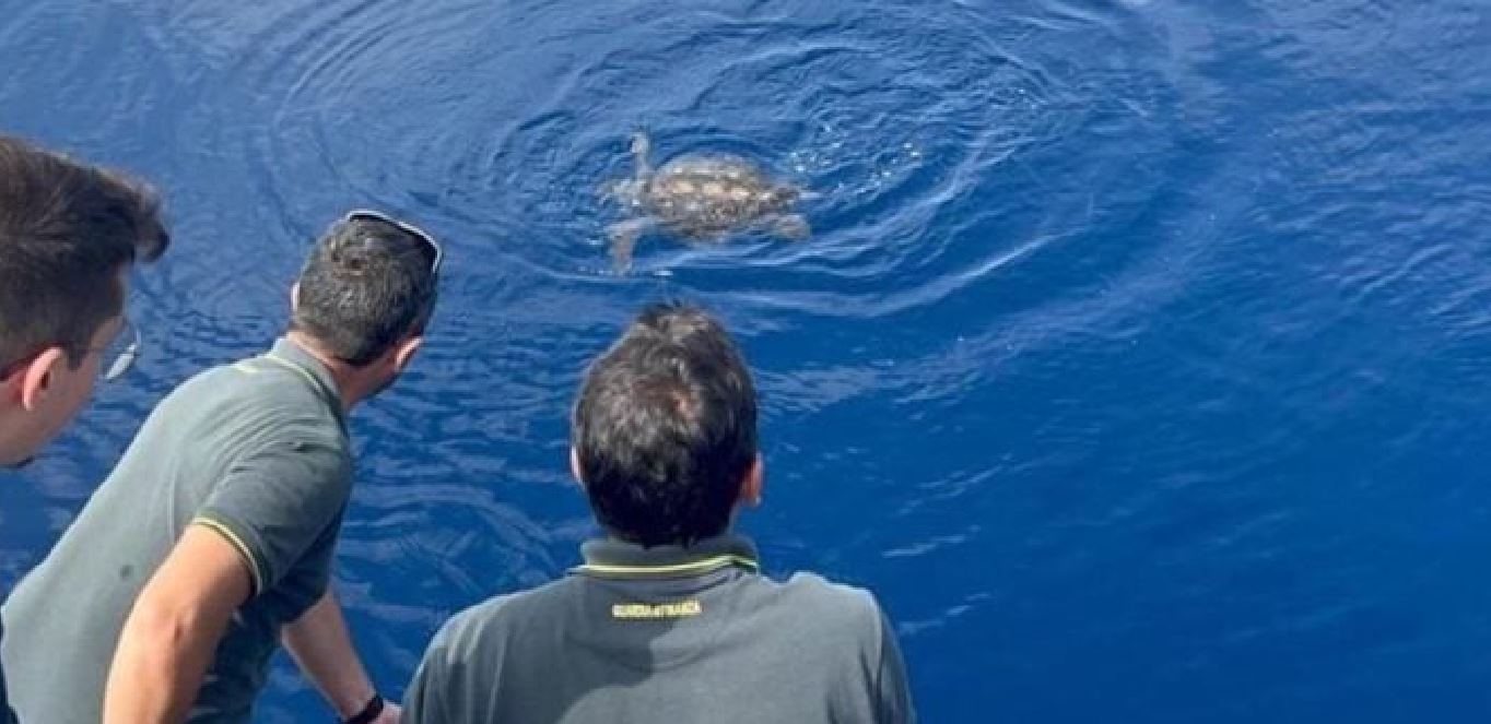 I Finanzieri della Stazione Navale di Vibo Valentia hanno avvistato al largo di Paola un esemplare di tartaruga marina Caretta Caretta, impigliata in un palangaro derivante illegale