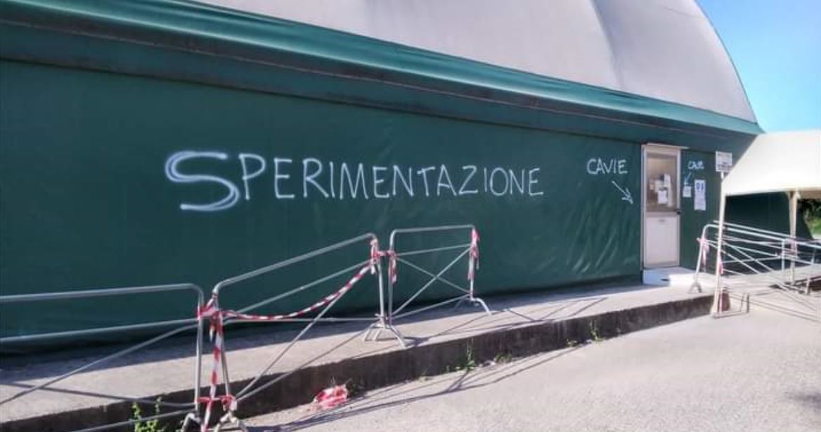 Due le scritte che capeggiano: “sperimentazione” e “cavie”