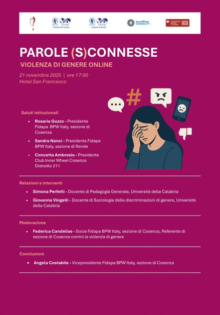 Per affrontare questo fenomeno crescente e spesso sottovalutato, oggi alle ore 17:00 presso l’Hotel San Francesco di Rende si terrà l’evento “Parole (S)connesse – Violenza di genere online”, promosso dalle sezioni di Cosenza e Rende della Fidapa BPW Italy e dal Club Inner Wheel Cosenza, in collaborazione con l’Università della Calabria.