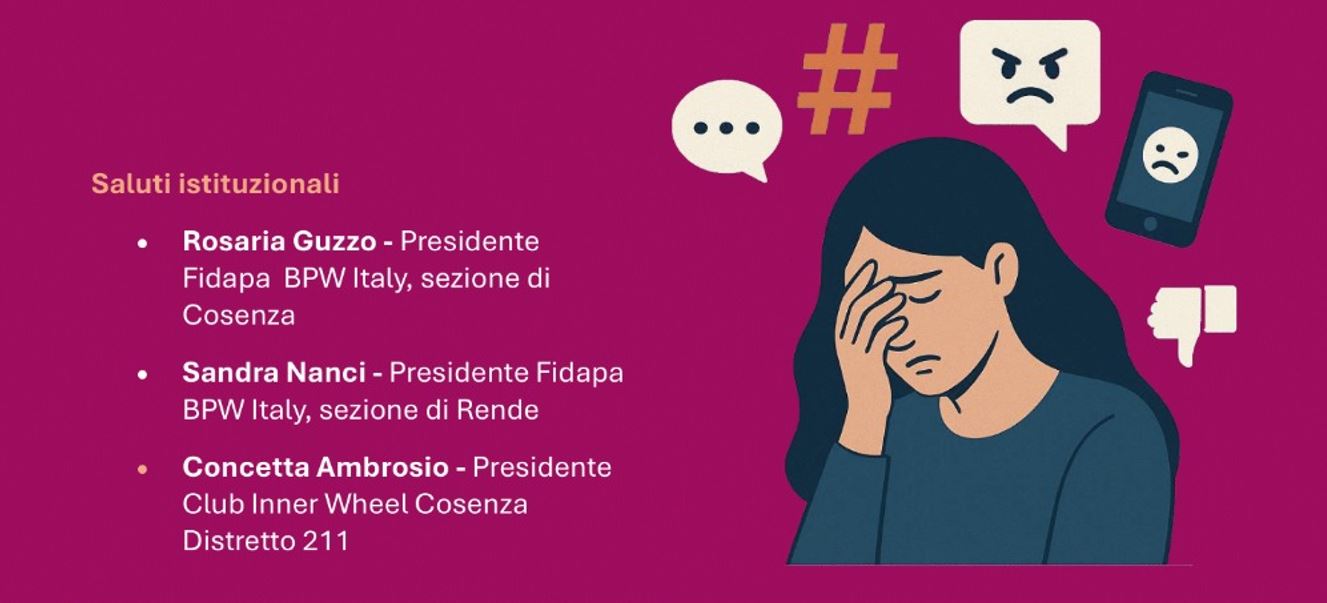 L’incontro si aprirà con i saluti istituzionali di Rosaria Guzzo, presidente della sezione di Cosenza di Fidapa BPW Italy; Sandra Nanci, presidente della sezione di Rende; e Concetta Ambrosio, presidente del Club Inner Wheel Cosenza Distretto 211. Nelle loro dichiarazioni, le rappresentanti delle associazioni hanno sottolineato l’urgenza di porre l’attenzione sulla violenza di genere e sull’impatto crescente della dimensione digitale, proponendo strumenti di prevenzione e sensibilizzazione.