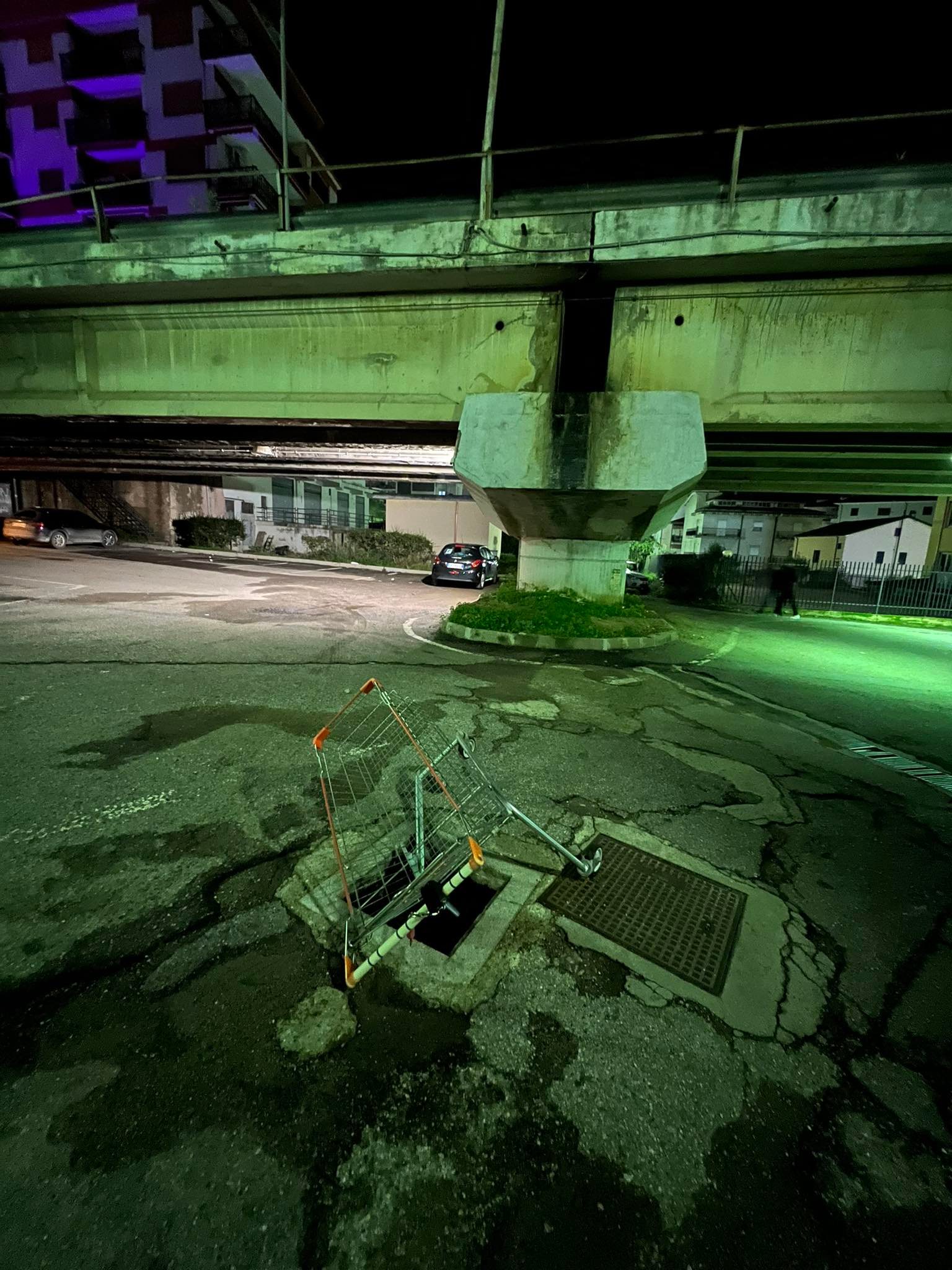 Qualcuno, per segnalare il pericolo e restringere in qualche modo il diametro dell’apertura, ci ha messo sopra un carrello della spesa, ma non può assolutamente restare in questo modo.