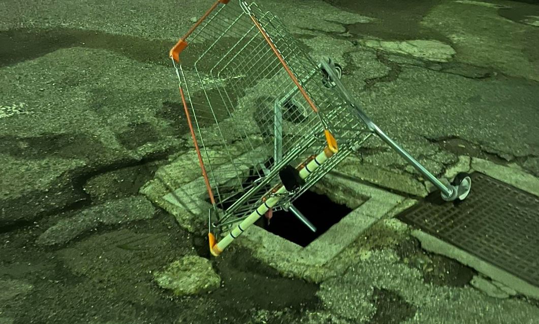 “Pericolosissimo tombino scoperto segnalato da un carrello della spesa”