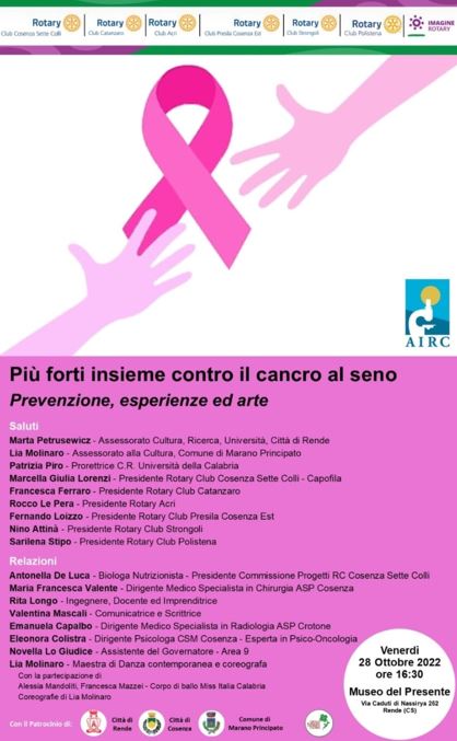 L’incontro è promosso dal Rotary Club Cosenza Sette Colli in collaborazione con AIRC e con i RC di Catanzaro, Acri, Presila Cosenza Est, Strongoli e Polistena e con il patrocinio delle Città di Rende e Cosenza e del Comune di Marano Principato.