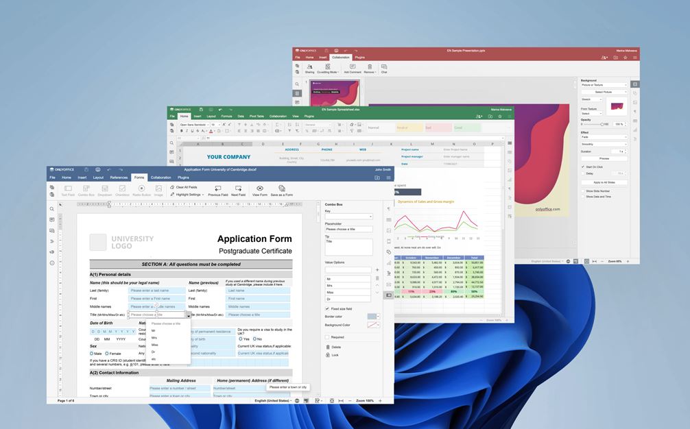 ONLYOFFICE Docs è un ufficio collaborativo online completamente compatibile con i file MS Office (OOXML) e supporta tutti i formati più diffusi, inclusi ODF, PDF, e-book e modelli di moduli ecc.