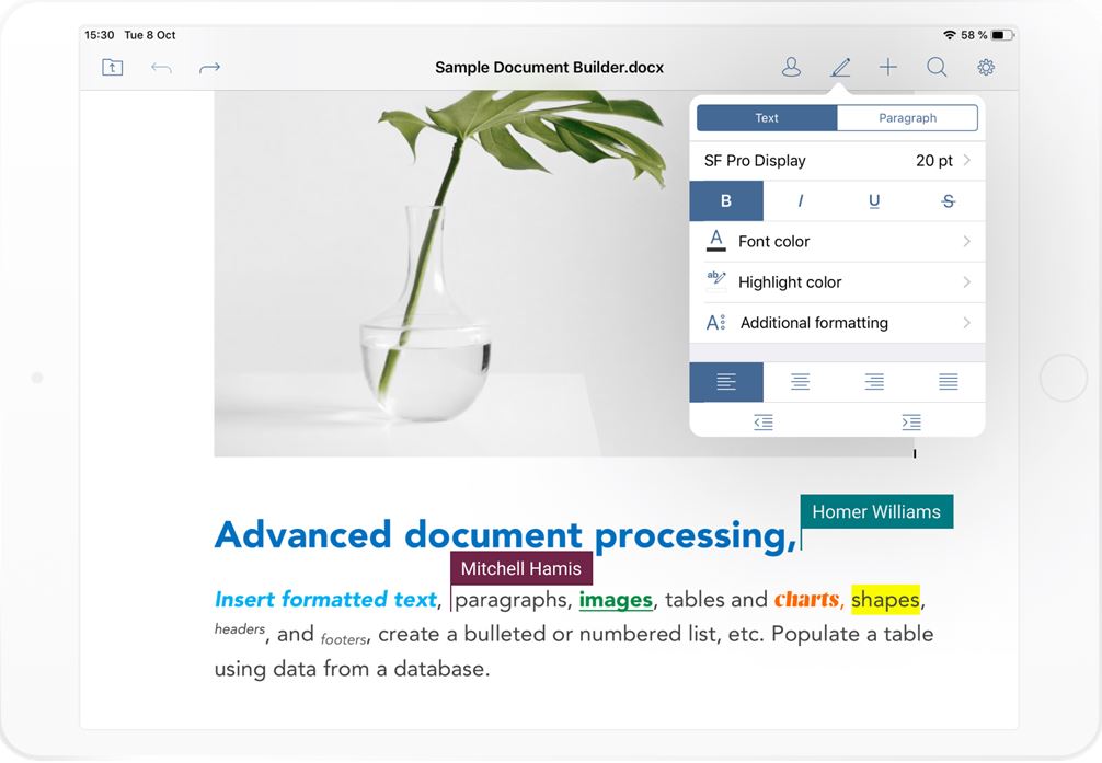 Le funzionalità di modifica e formattazione richieste nel tuo lavoro quotidiano con i documenti sono a portata di mano: gli strumenti professionali per lavorare con documenti di testo, fogli di calcolo e presentazioni consentono di creare file di qualsiasi complessità. Usa oggetti, tabelle, grafici, equazioni, immagini e rendi i tuoi documenti ben strutturati per qualsiasi scopo, scegliendo il layout e stili di formattazione più adatti.