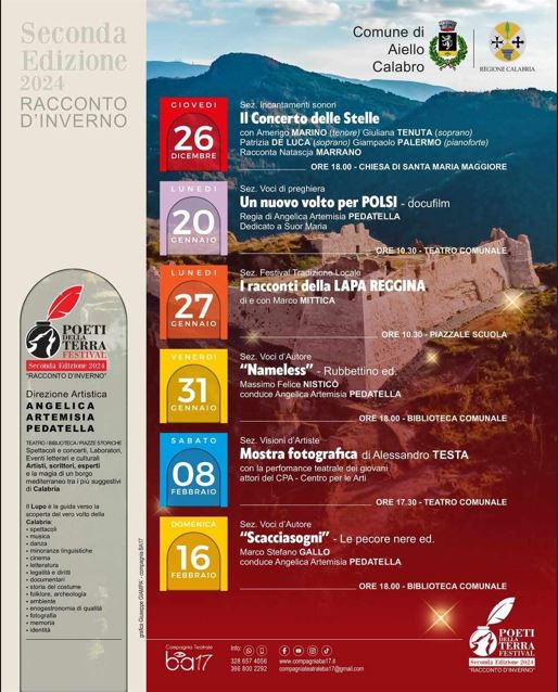 Il 27 gennaio arriva la straordinaria creatività di Marco Mittica, il cantastorie che con la sua ape, trasformata in teatro, racconta gli episodi più iconici della storia di Calabria. Conclude il 31 gennaiol’opera “Nameless” di Massimo Felice Nisticò, opera visionaria e distopica, con una scrittura potentissima e un autore quasi mattatore in grado di affascinare qualunque platea, per un nuovo format letterario che all’interno di “VOCI D’AUTORE” inaugura un anno letterario del tutto inedito ad Aiello Calabro. L’8 febbraio la performance dei ragazzi del CPA – Centro Per le Arti introdurrà la mostra e l’intervista ad Alessandro Testa, il fotografo che ha ritratto le artiste calabresi, per raccontare una regione al femminile fatta di creatività, coraggio e gentilezza, un’opera unica nel suo genere che per la prima volta offre una panoramica assolutamente originale della Calabria. L’affascinante avventura dello “Scacciasogni” di Marco Stefano Gallo fa calare il sipario il 16 febbraio su questa edizione invernale del festival.