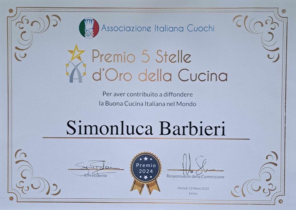 I cinque chef Calabresi premiati dal Presidente Simone Falcini e dal vice presidente Daniele Gorini, che con il loro contributo hanno orgogliosamente messo in mostra la propria regione, sono le 2 riconferme, avendole già ottenute nel 2023, per lo Chef Barbieri Simonluca del Ristorante La Calura di Roccella Jonica (Rc) e la woman Chef Francesca Marino (Già medaglia d’oro ai campionati italiani Aic 2023) di Cassano All’Ionio (Cs) si aggiungono a loro, alzando il livello gastronomico Calabrese, la Woman chef Laura Mauro, della Taverna dei sette peccati di San Pietro Apostolo (CZ), lo chef Pasquale Virardi del ristorante la Bodeguita di Corigliano (Cs) e lo chef di adozione Calabrese, Marco Piccolo ex Masterchef 10 del risto-pescheria Maresità a Roma
