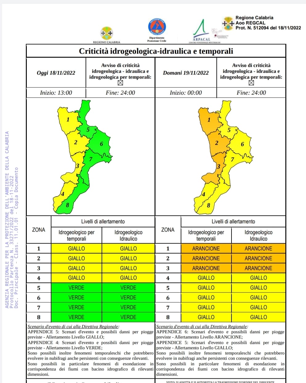 Allerta arancione per domani, 19 novembre, sulla fascia tirrenica centrosettentrionale, compresa la città di Cosenza, e gialla nel resto della Calabria, diramato questo pomeriggio dalla Protezione Civile Calabria.