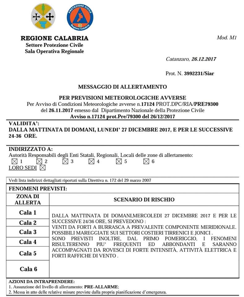 Il bollettino diffuso pochi minuti fa dalla Protezione Civile Calabria:
