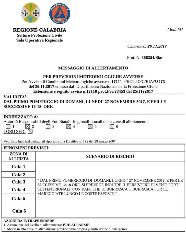 Il bollettino appena diffuso dalla protezione Civile Calabria: