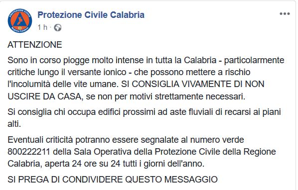 Il messaggio di allertamento diffuso poco fa dalla Protezione Civile Calabria