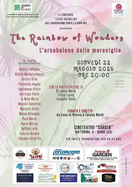 Punto e a Capo APS, in collaborazione con la Compagnia Teatro Arcobaleno e il Teatro dei Fliaci, è lieta di presentare lo spettacolo “The Rainbow of Wonders”, che andrà in scena giovedì 22 maggio 2025 alle ore 20:00, presso il Cineteatro Garden di Rende (CS)