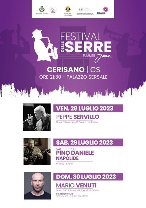 Spazio poi al weekend: venerdì 28 luglio, alle ore 21,30, l’esibizione di Peppe Servillo (Guest: Molinaro, Barozzi, Rossin); sabato 29 luglio omaggio al grande Pino Daniele con un “salotto musicale” con Raso e Iorio mentre la domenica sera, 30 luglio, sempre a palazzo Sersale, il concerto di Mario Venuti, insieme ai musicisti Calabrese, Santelli e Di Vita al termine del quale sarà consegnato il premio “Festival delle Serre d’autore”.