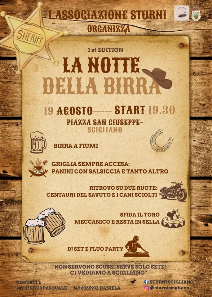 “L’Associazione Sturni, che opera attivamente sul territorio di Scigliano, per questa sera, 19 Agosto, ha organizzato la prima edizione della “Notte della Birra” in Piazza San Giuseppe a Scigliano, appunto, in una location all’aperto che per l’occasione sarà allestita tutta in stile country.
