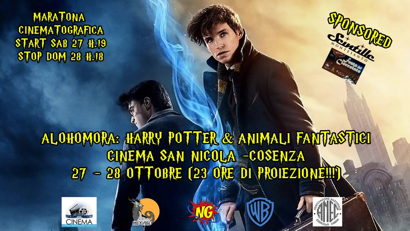 “ALOHOMORA รจ la maratona organizzata e patrocinata da Cinema Cosenza, Cinema Citrigno Cosenza, Midgard – Fumetteria, Ludoteca & Eventi, Warner Bros. Pictures, ANEC Associazione Nazionale Esercenti Cinema e sponsorizzata da Scintille Montesanto Gioielleria!