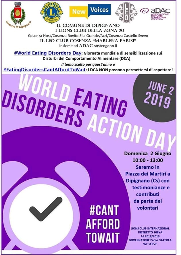 I Lions Club della Zona 20 (Cosenza Host/Cosenza Rovito Sila Grande/Acri/Cosenza Castello Svevo) insieme al Leo Club Cosenza “Marlena Parisi” e in collaborazione con il Comune di Dipignano svolgeranno una giornata di sensibilizzazione con testimonianze e contributi sul delicato tema dei Disturbi del Comportamento Alimentare (DCA).