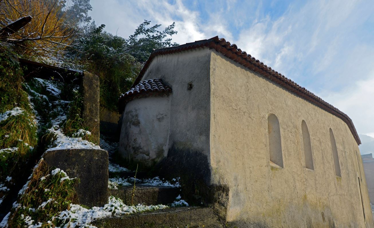 Il cenobio comprendeva un katholikon, una chiesa monasteriale, l’attuale chiesetta di S. Leonardo, di dimensioni molto più contenute di quelle odierne, alla quale si accedeva dal suo interno attraverso due porte ad arco, le stesse che oggi sormontano gli altari laterali seicenteschi, in muratura, su uno dei quali ancora si distingue un pregiato affresco di Giovan Battista Colimodio, raffigurante il “Compianto su Cristo morto”.