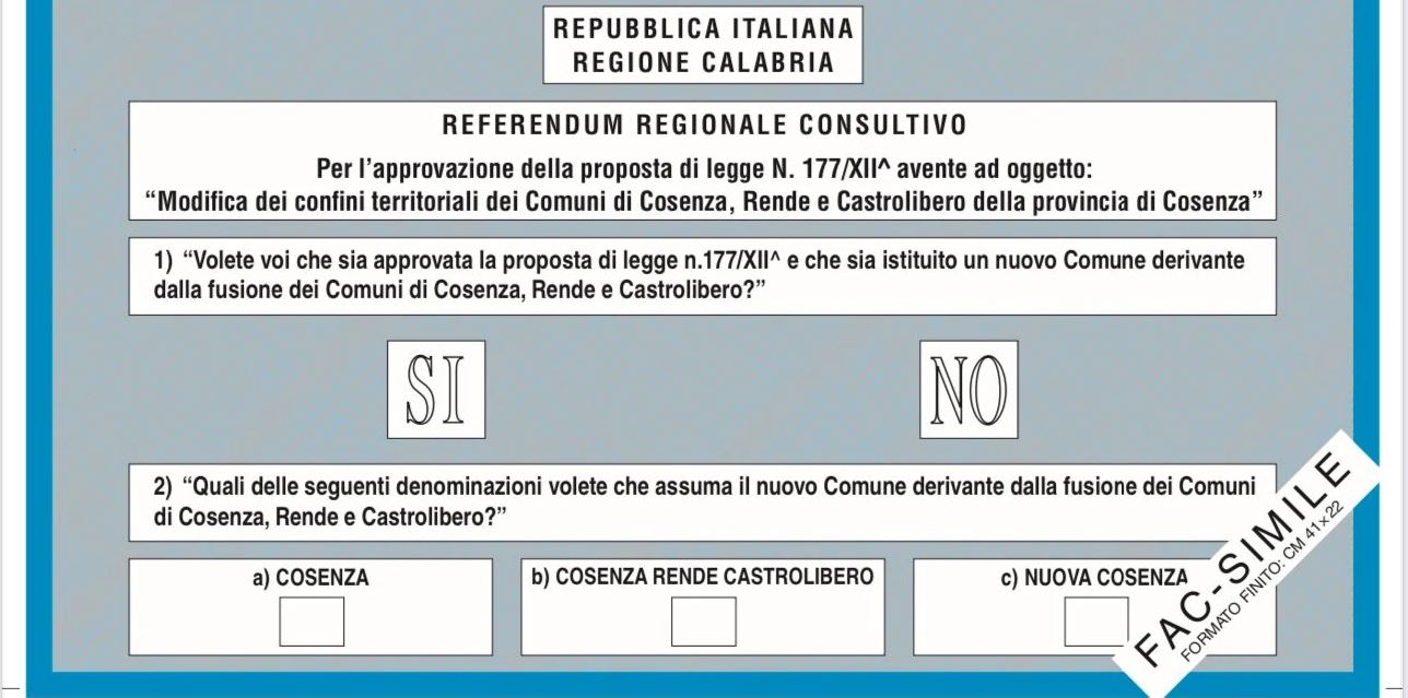 Ai cittadini chiamati ad esprimere il proprio voto sarà consegnata una sola scheda con i due quesiti. Il primo quesito è il seguente: “Volete voi che sia approvata la proposta di legge n. 177/XII e che sia istituito un nuovo comune derivante dalla fusione dei Comuni di Cosenza, Rende e Castrolibero?”.