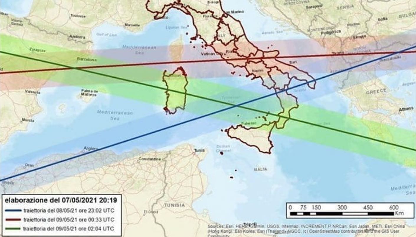 La nota della Prociv spiega, inoltre, che «si tratterà di un passaggio rapido, di pochi secondi, considerando che il razzo sta viaggiando a 7,8 km al minuto. Si potranno avvistare palle di fuoco e avvertire forti boati. I frammenti in caduta potranno avere una dimensione fino a un massimo di un metro e mezzo, pesare qualche centinaio di chili e raggiungere un metro di profondità all’impatto. Le previsioni di rientro saranno soggette a continui aggiornamenti perché legate al comportamento del vettore spaziale stesso e agli effetti che la densità atmosferica imprime agli oggetti in caduta, nonché a quelli legati all’attività solare».