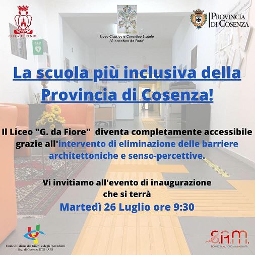 Sarà inaugurata martedì 26 luglio alle 9,30 a Rende la prima scuola completamente accessibile della provincia di Cosenza: il Liceo Classico e Coreutico Gioacchino Da Fiore sarà infatti il primo istituto senza barriere architettoniche e sensoriali.
