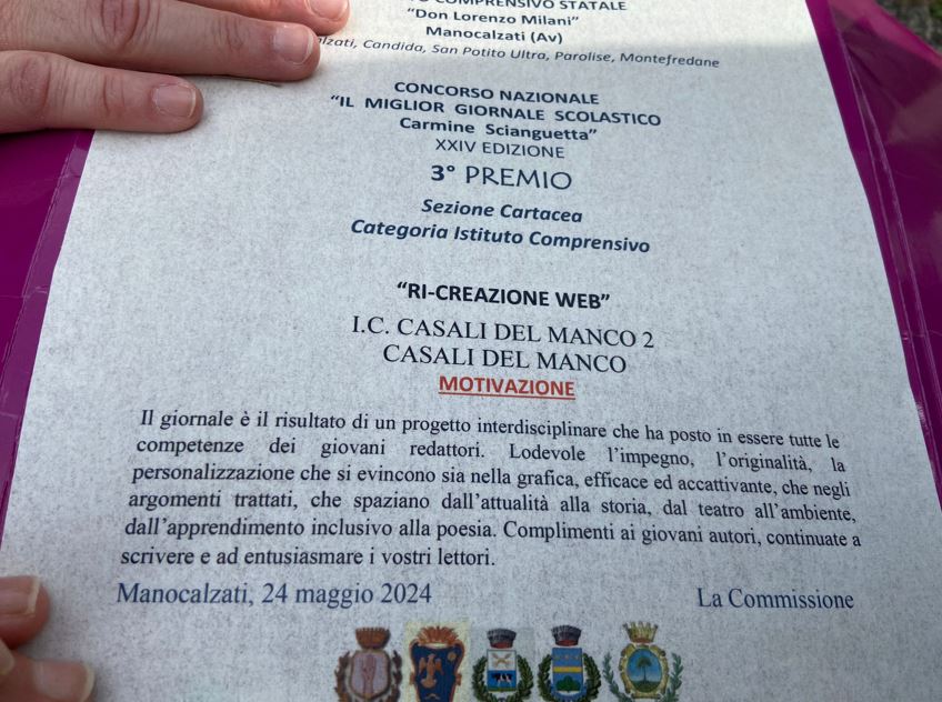 Nel corso della premiazione svoltasi venerdì 24 maggio 2024 a Manocalzati (AV), RI-CREAZIONE WEB ha ottenuto il 3° Premio per la Sezione “Cartacea” Categoria “Scuola Secondaria di primo grado”. Il Concorso Nazionale “Il Miglior Giornale Scolastico” Carmine Scianguettaè promosso dall’ I.C. “Don Lorenzo Milani” di Manocalzati. La motivazione del premio è la seguente: “il giornale è il risultato di un interdisciplinare che ha postoin essere tutte le competenze dei giovani redattori.