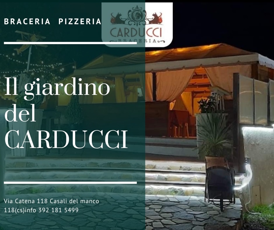 Per il 4° anno consecutivo apre il giardino estivo del Carducci Braceria, in Via Catena n 118 a Casali del Manco, che quindi dalla serata di sabato 22/6/2024, introduce la pizzeria con forno a legna, servizio che poi (e questa è una novità) si protrarrà per tutto l’anno.