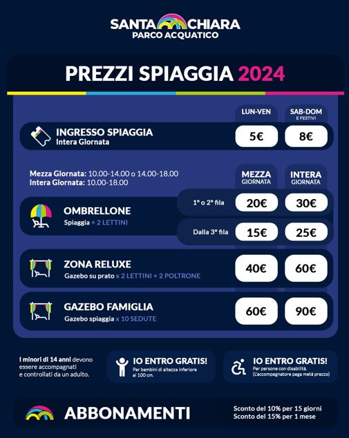 Con l’arrivo dell’estate 2024, il Parco Acquatico Santa Chiara di Rende si prepara ad accogliere i visitatori con una serie di novità che rendono questa stagione particolarmente attesa. Da Sabato 1 Giugno sarà ufficialmente riaperta al pubblico la SPIAGGIA all’aperto, il luogo ideale per rilassarsi al sole, godere delle acque rinfrescanti del parco ed avere una perfetta oasi estiva nel centro città per staccare dalla routine senza allontanarsi troppo. Per un paio di giorni a settimana la piscina chiuderà alle ore 20:30 al fine di prolungare la permanenza e allietare i suoi ospiti con deliziosi aperitivi.