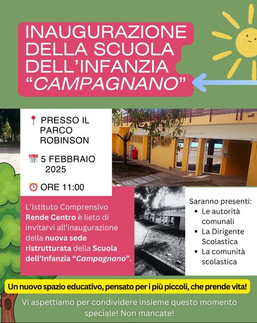 Per anni la scuola dell’Infanzia Campagnano/Parco Robinson è stata il fiore all’occhiello della città di Rende. Una grande risorsa per le famiglie dei piccoli utenti che ogni giorno entravano, con gioia,in un vero Parco giochi per raggiungere maestre e compagni. Poi c’è stata una fase di oblio. La Scuola e il Parco hanno risentito dell’inesorabile trascorrere del tempo che usura spazi e luoghi rendendoli meno accoglienti. Ma tutto questo è solo un ricordo e finalmente si restituisce la scuola al Parco e il Parco alla Scuola, ai suoi bambini e alle loro famiglie.