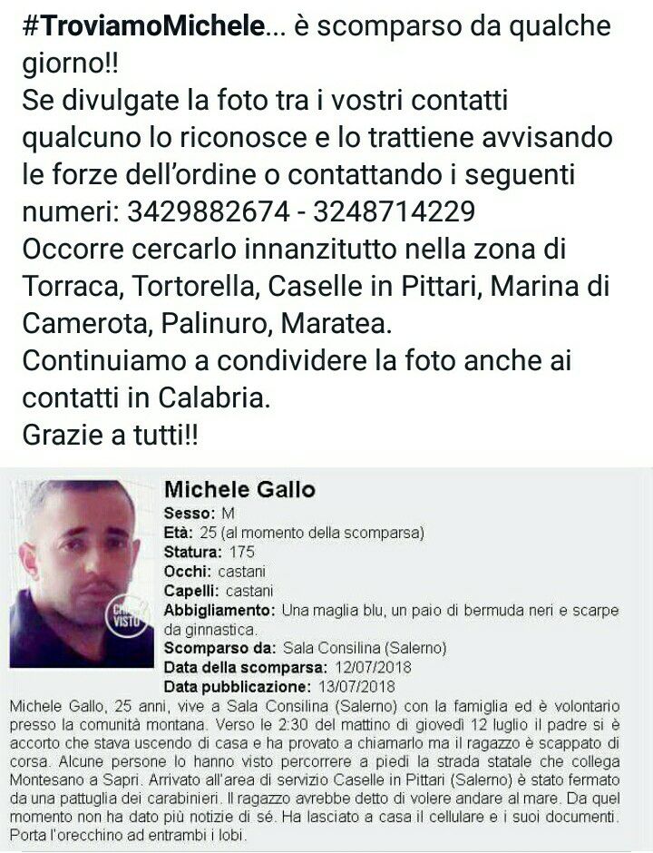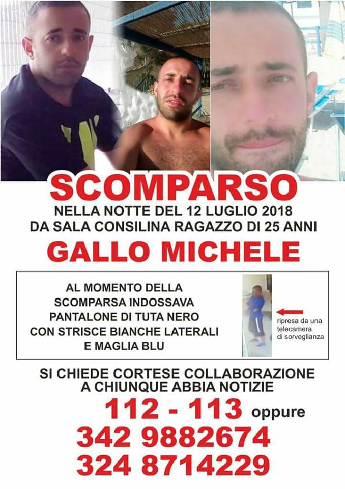 “Michele Gallo, 25 anni, vive a Sala Consilina (Salerno) con la famiglia ed è volontario presso la comunità montana. Verso le 2:30 del mattino di giovedì 12 luglio il padre si è accorto che stava uscendo di casa e ha provato a chiamarlo ma il ragazzo è scappato di corsa. Alcune persone lo hanno visto percorrere a piedi la strada statale che collega Montesano a Sapri. Arrivato all’area di servizio Caselle in Pittari (Salerno) è stato fermato da una pattuglia dei carabinieri. Il ragazzo avrebbe detto di volere andare al mare. Da quel momento non ha dato più notizie di sé. Ha lasciato a casa il cellulare e i suoi documenti. Porta l’orecchino ad entrambi i lobi. In questa immagine ripresa dalle telecamere della videosorveglianza dell’area di servizio si può vedere il suo abbigliamento al momento della scomparsa.