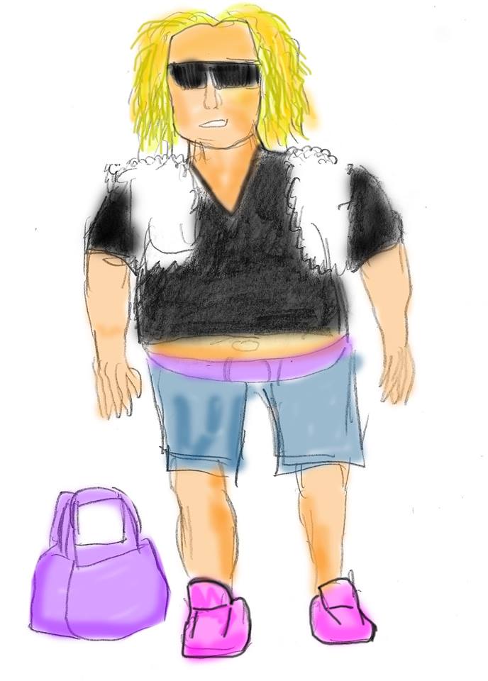 Abbigliamento stile glam rock anni 70, tendente al nero, scarpe violette, capelli biondi mossi ondulati fino alle spalle, altezza 170, corporatura tracagnotto, parla da solo e offende la gente senza motivo.