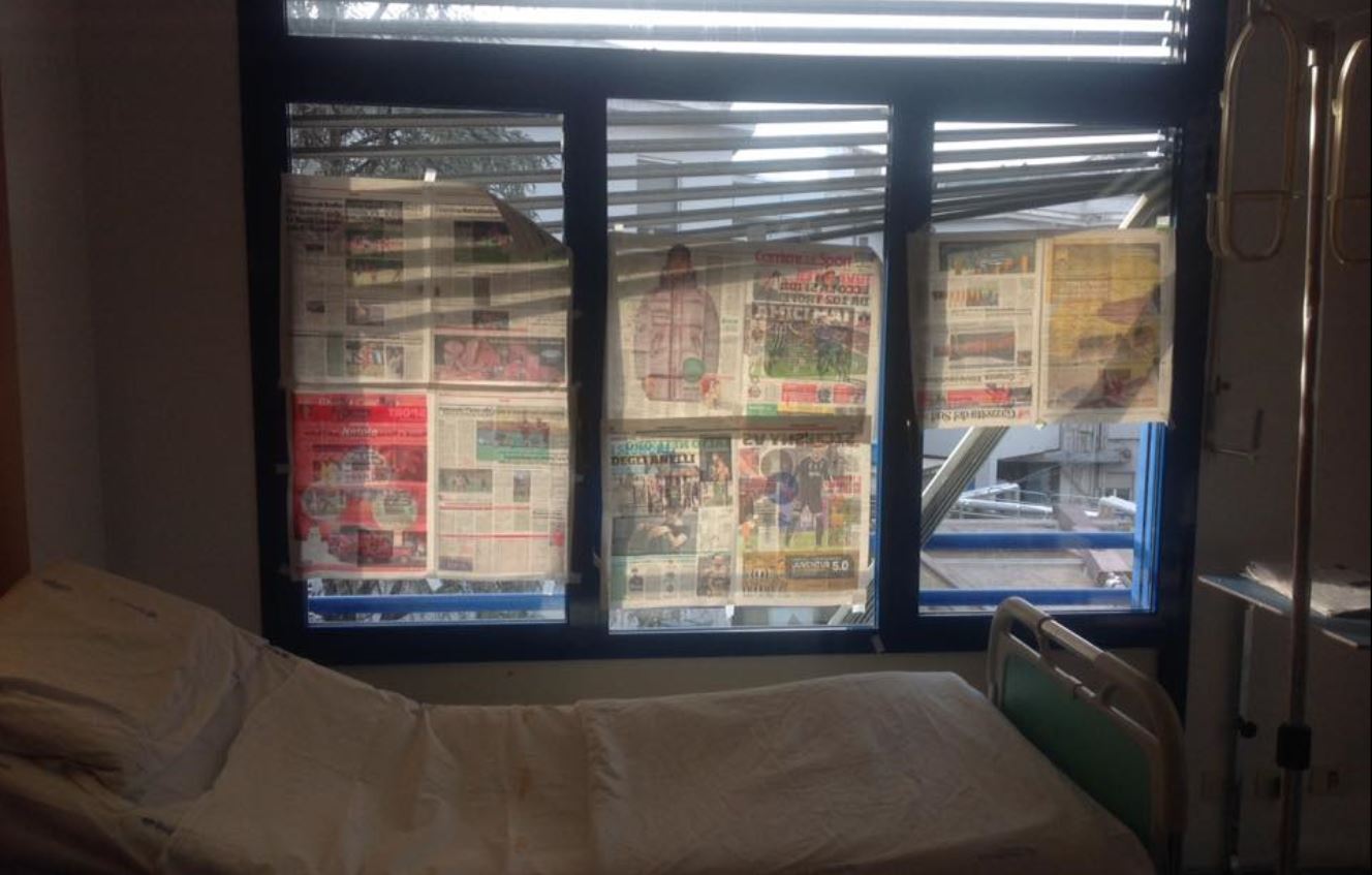 Però non posso fare a meno di notare che la tenda, che funge anche da tapparella, 2 anni fa era rotta… e con mio enorme stupore (si fa per dire) questa ad oggi è nelle stesse condizioni, anzi, il mio vicino di letto per non morire bruciato dal sole ha pensato bene di improvvisare delle tendine molto carine.