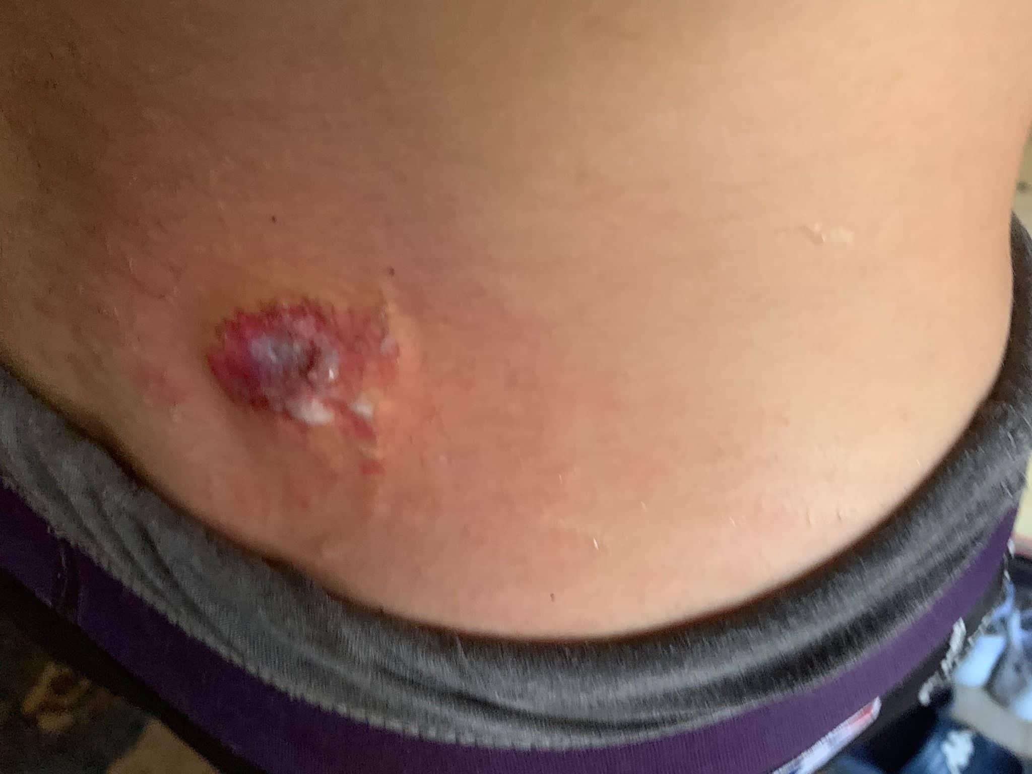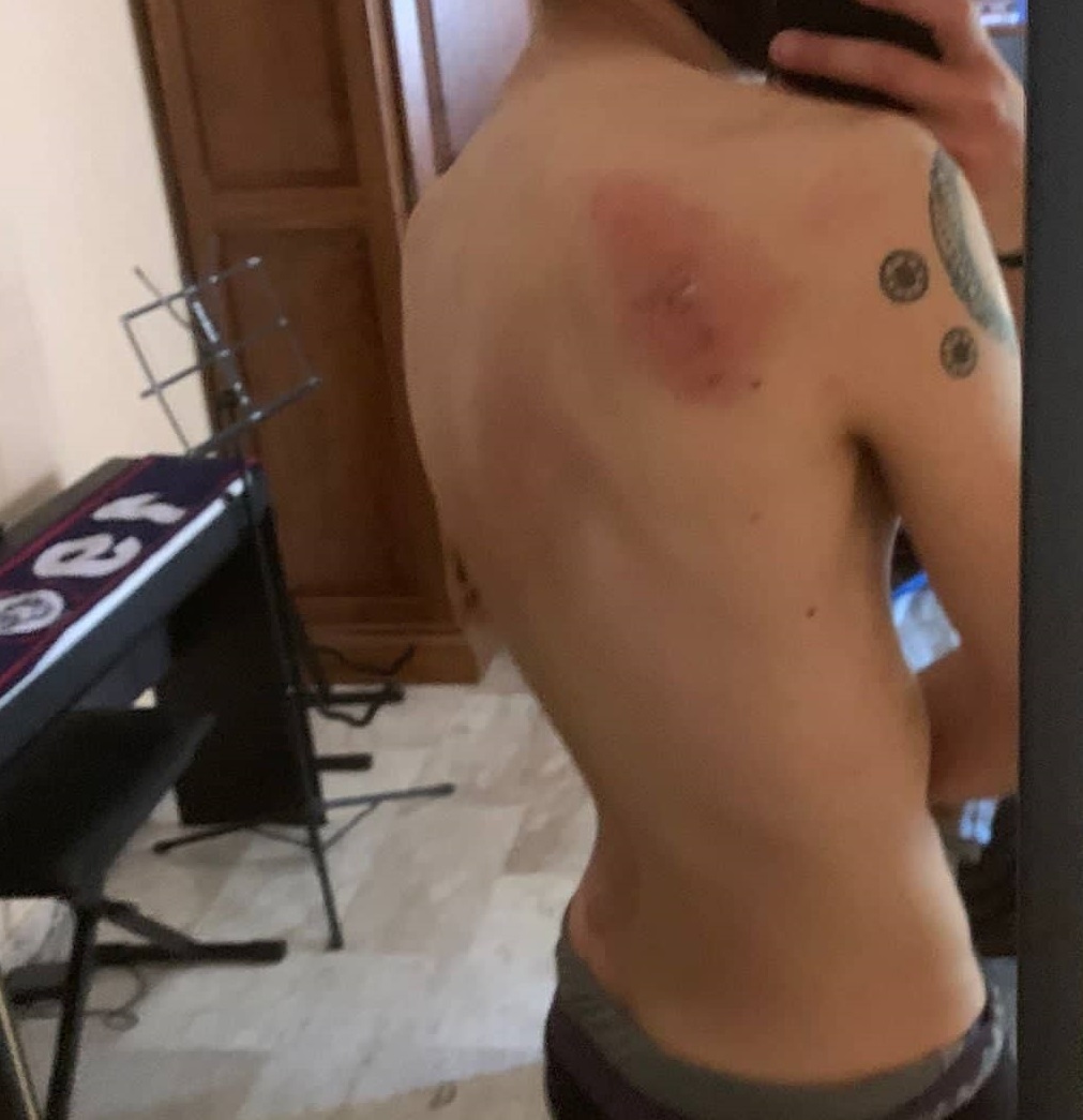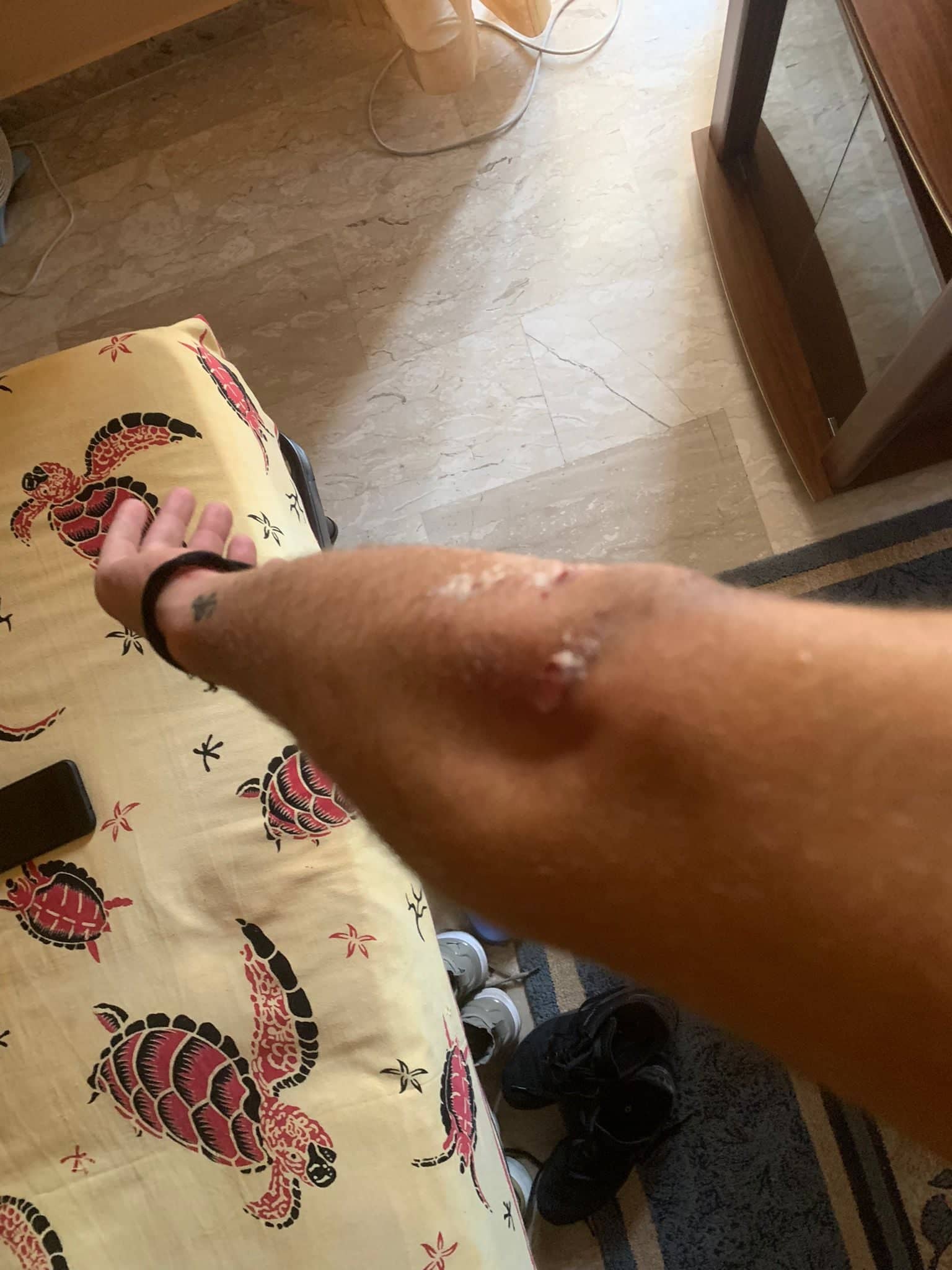 Non tanto la gamba, ma sulla schiena si vede la carne viva, e il gomito anche è messo male