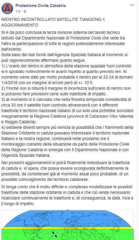 1) L’orario del rientro in atmosfera della stazione spaziale fuori controllo si รจ spostato notevolmente in avanti rispetto a quanto previsto ieri. Al momento viene dato per molto probabile il rientro per le 22:34 di domani 1/4/2018 con un margine di errore perรฒ di +/- 10 h.