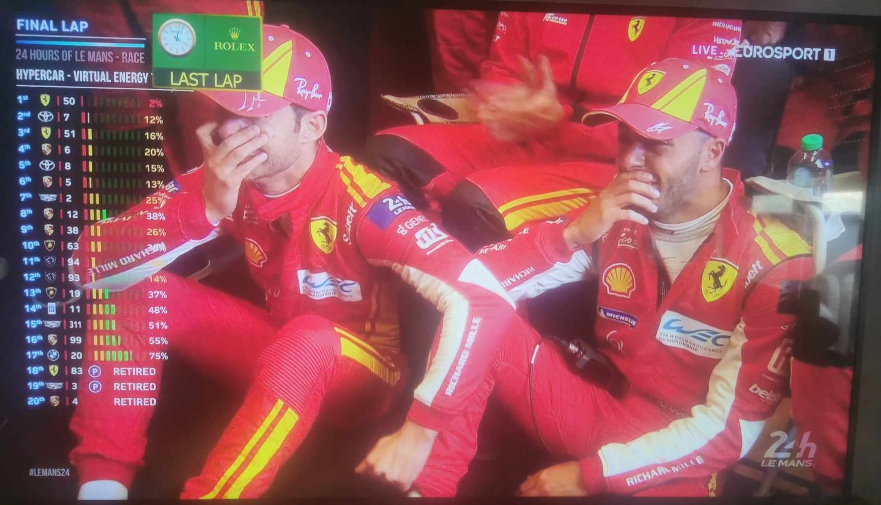 Ferrari vince con la vettura n. 50 di Antonio Fuoco/Nicklas Nielsen/Miguel Molina la 92ma edizione della 24 Ore Le Mans abbattendo nel finale la concorrenza della Toyota n. 7 di Kamui Kobayashi/Nick De Vries/José Maria Lopez. Il marchio di Maranello si conferma ottenendo l’11ma affermazione della propria storia dopo una gestione perfetta del carburante fino all’ultimo metro.
