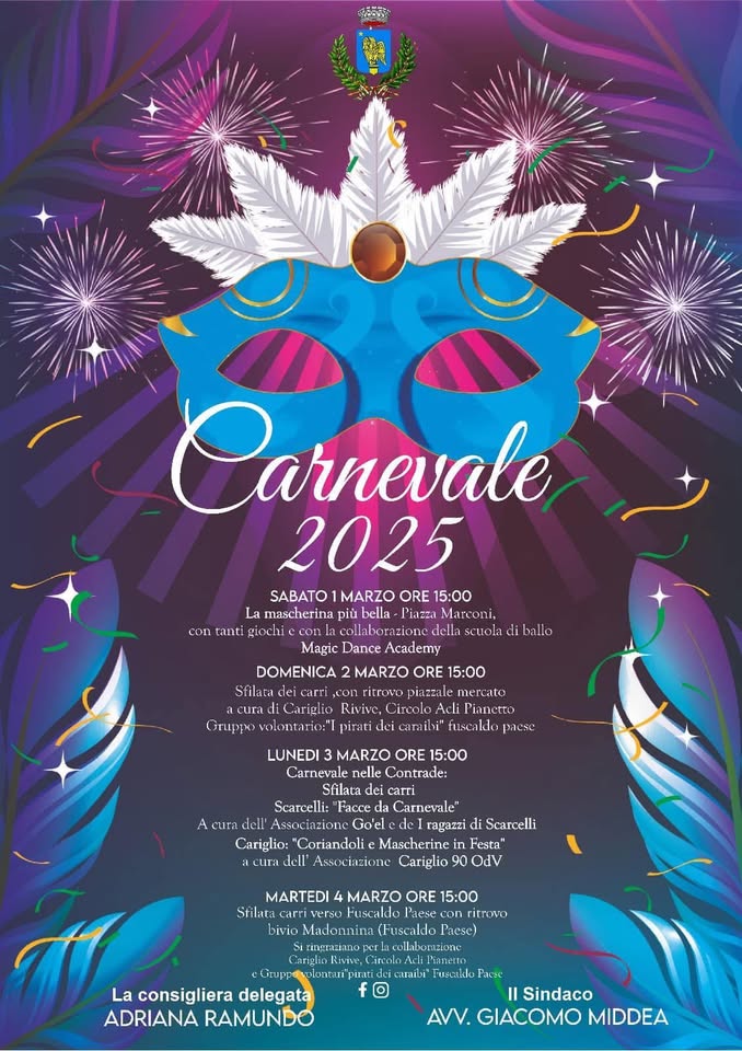 “Ritorna il “Carnevale di Fuscaldo” con un programma ricco e variegato, con l’anteprima di sabato 01 Marzo con la “La mascherina più bella” in piazza Marconi., giunta alla 4^ edizione.