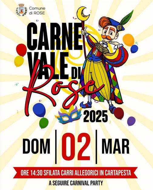 Domenica 2 marzo, le strade di Rose (CS) si accenderanno di colori, musica e allegria per uno degli eventi più attesi: il Carnevale di Rose 2025
