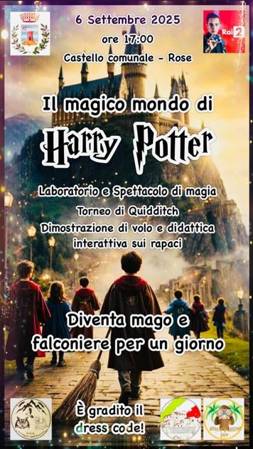 L’Amministrazione Comunale di Rose è lieta di presentare, sabato 6 settembre alle ore 17:00 presso il Castello Comunale nel cuore del centro storico di Rose, la seconda edizione de “Il Magico Mondo di Harry Potter”