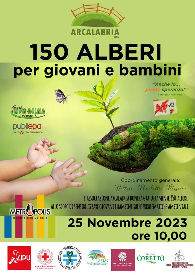 Come tutti gli anni, anche quest’anno Arcalabria ha organizzato la manifestazione “Piantiamo Speranza”. Giunta alla sua IV edizione, curata e condotta dalla socia Dott.ssa Nicoletta Mascaro, responsabile del settore ambiente e dalla nostra collaboratrice Caterina Bozzo, verranno distribuiti oltre 150 alberi presso il Centro Commerciale Metropolis al fine di sensibilizzare bambini, giovani, adolescenti in particolare, ma tutte le persone che dovranno prendersi cura dell’ambiente.