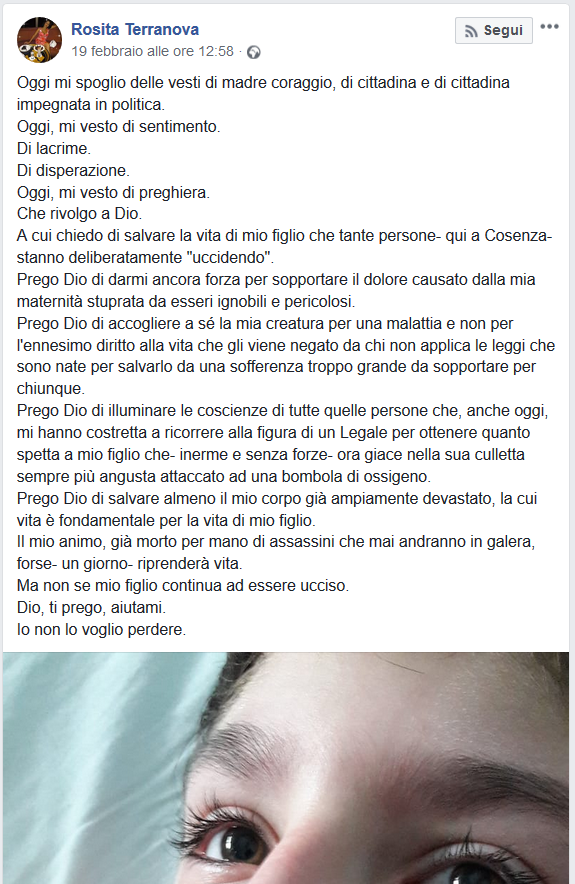 “Salvate la vita di mio figlio. Qui a Cosenza lo stanno deliberatamente ‘uccidendo’.”