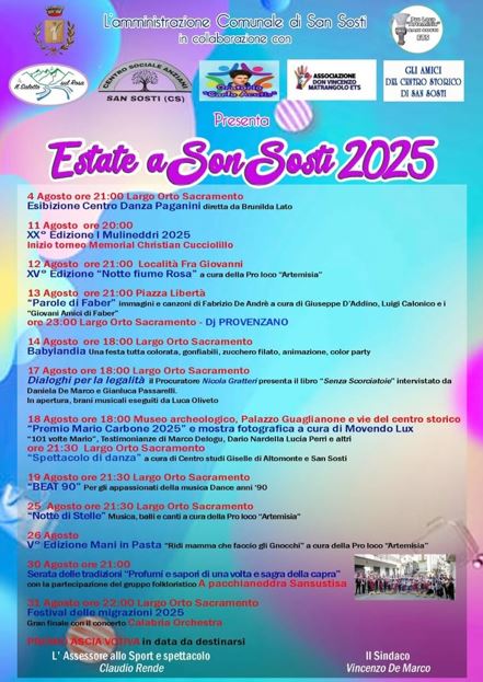 “Estate a San Sosti 2025”, è organizzato dall’Amministrazione Comunale in collaborazione con associazioni locali e realtà culturali del territorio.