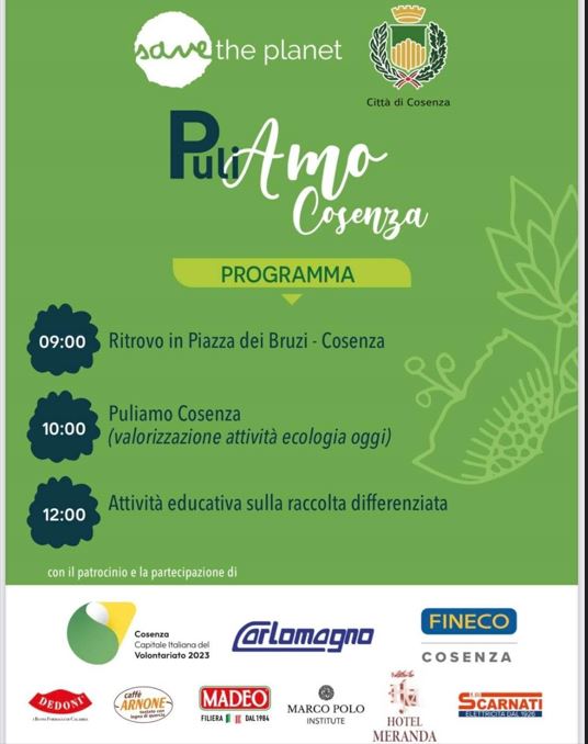 Il 10 giugno ore 9 a Cosenza piazza dei Bruzi, PuliAmo Cosenza, giornata dedicata alla sostenibilità compartecipata dal Comune di Cosenza.
