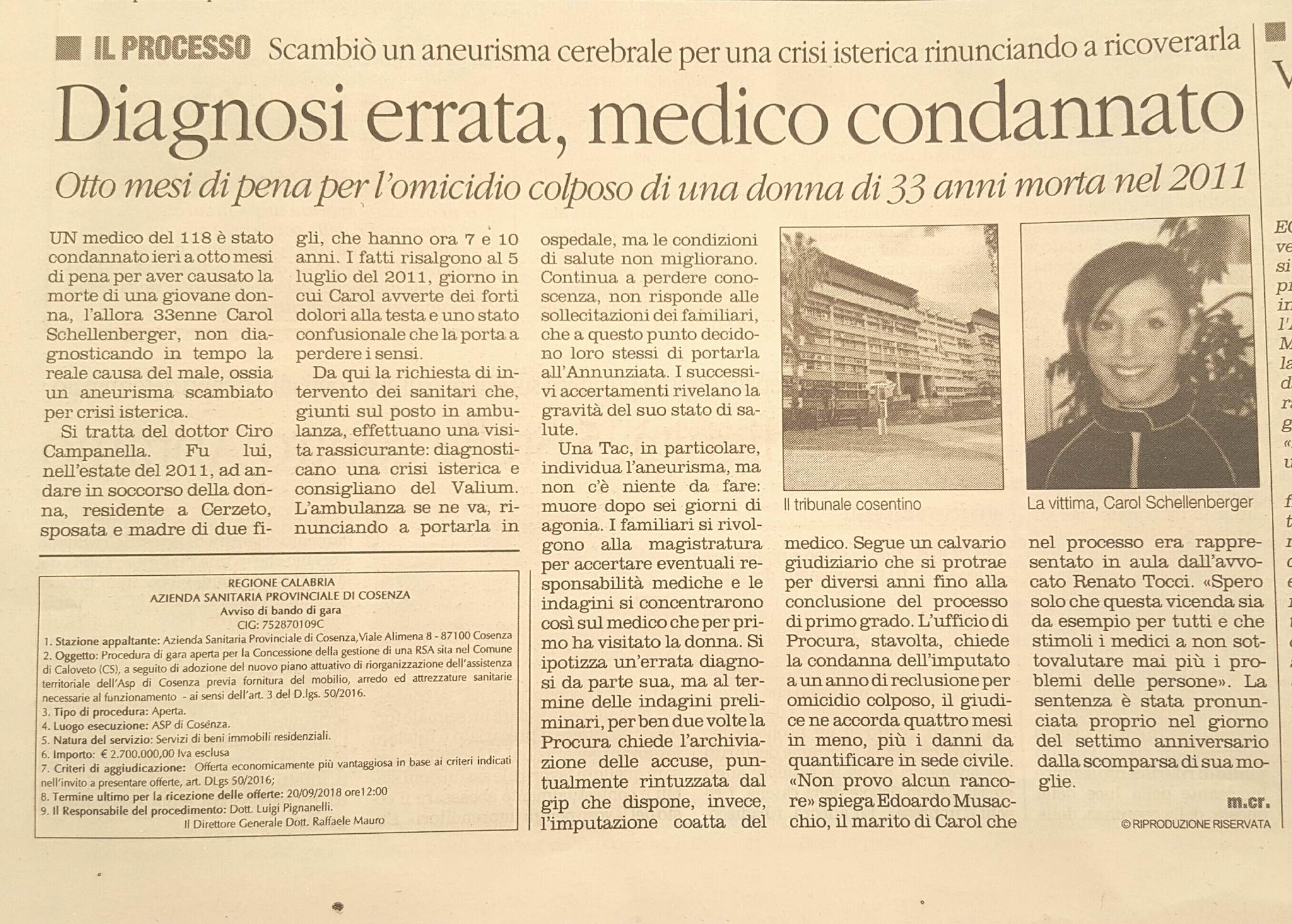 Il dottore del 118 si era rifiutato di portare Carol in ospedale, in quella maledetta sera del 5 luglio 2011, quando questa in piazza a Cerzeto si accasciò.