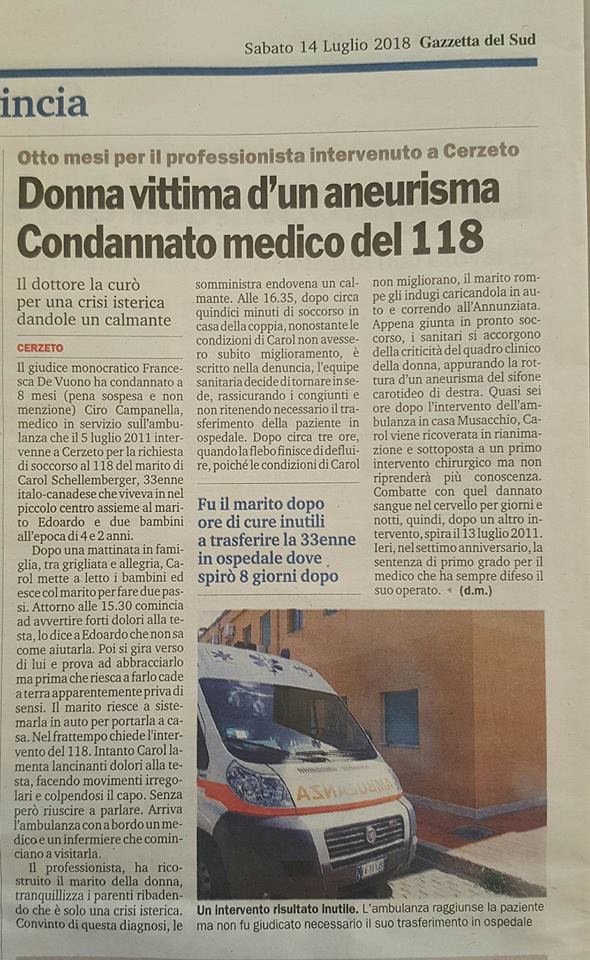 Ieri, a distanza di 7 anni esatti dal giorno della morte di Carol, 13 luglio, è arrivata la condanna del medico che a suo tempo ha fatto la diagnosi errata, strappando cosi una moglie dalle braccia del marito Edoardo… e privando dell’affetto di una mamma i piccoli Daniel e Carmine, all’epoca di 1 anno e 10 mesi e 4 anni e 4 mesi.