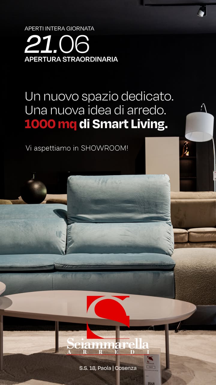 Inaugura domani, sabato 21 giugno, presso il showroom situato sulla S.S. 18 a Paola, un nuovo spazio espositivo nel quale la storica azienda “Sciammarella Arredi” lancia ufficialmente “Smart Living”: il design accessibile che cambia le regole dell’arredamento. Dal lusso su misura alla bellezza per tutti: l’azienda cosentina apre un nuovo capitolo con una linea giovane, dinamica e conveniente.